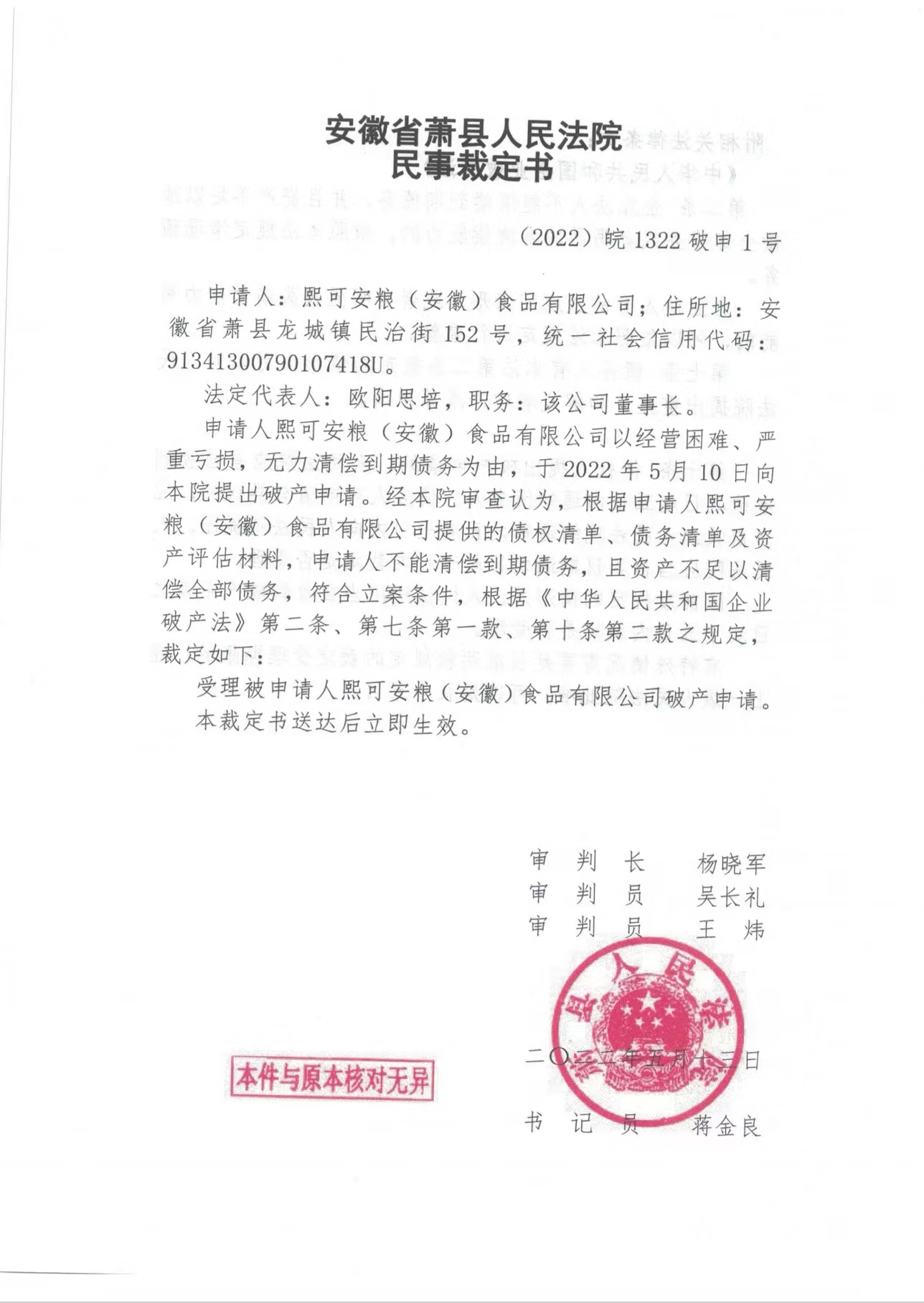 · 熙可安糧(安徽)公司依法破產 2022-07-06